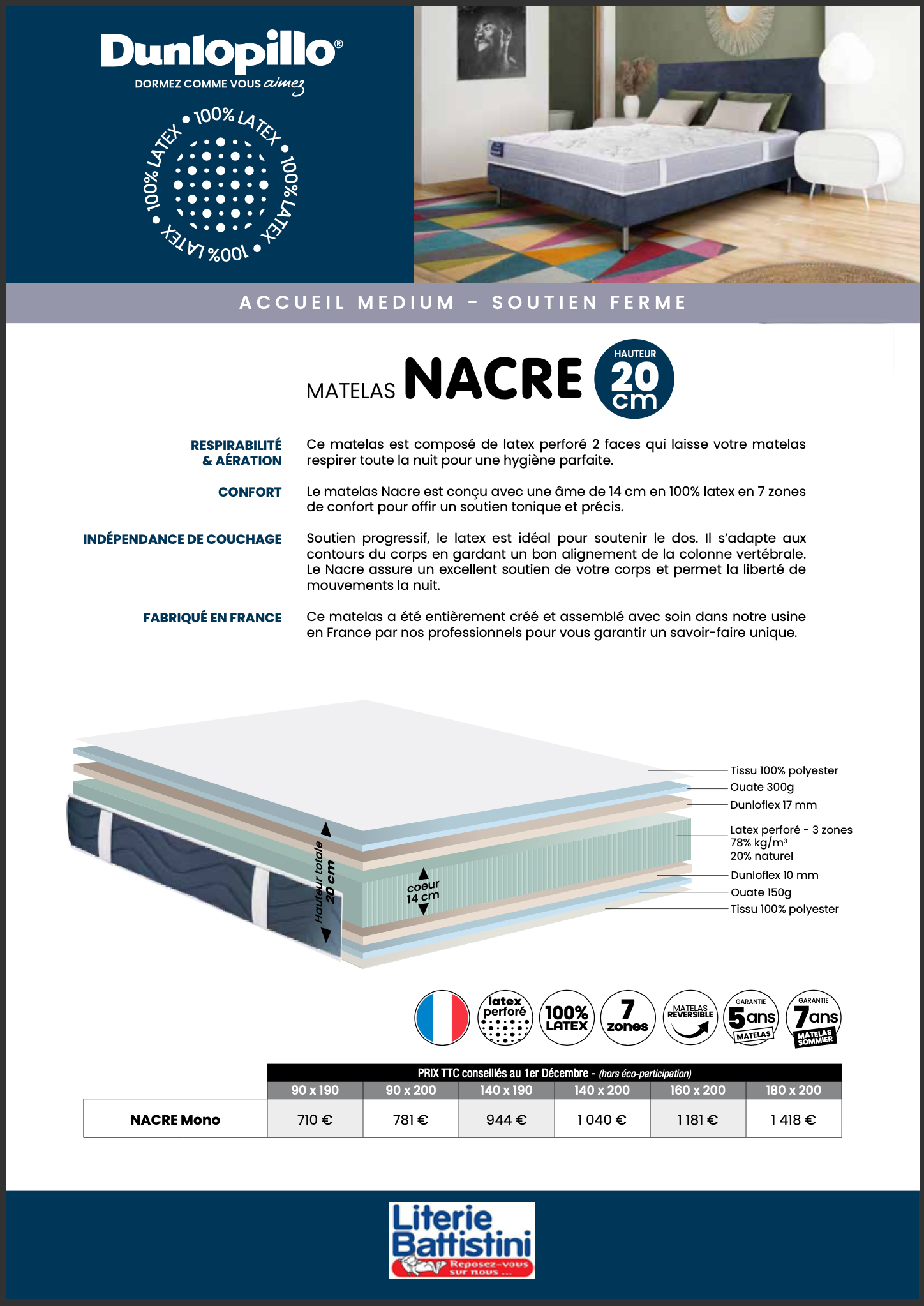 Fabriqué en France, ce sont des professionnels dotés d'un savoir-faire unique qui ont assemblé le matelas Dunlopillo Nacre.